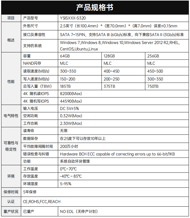 YSISXXX-S320產品采用4通道SSD控制器和2D/3D MLC NAND Flash,接口尺寸 為2.5寸SATA。