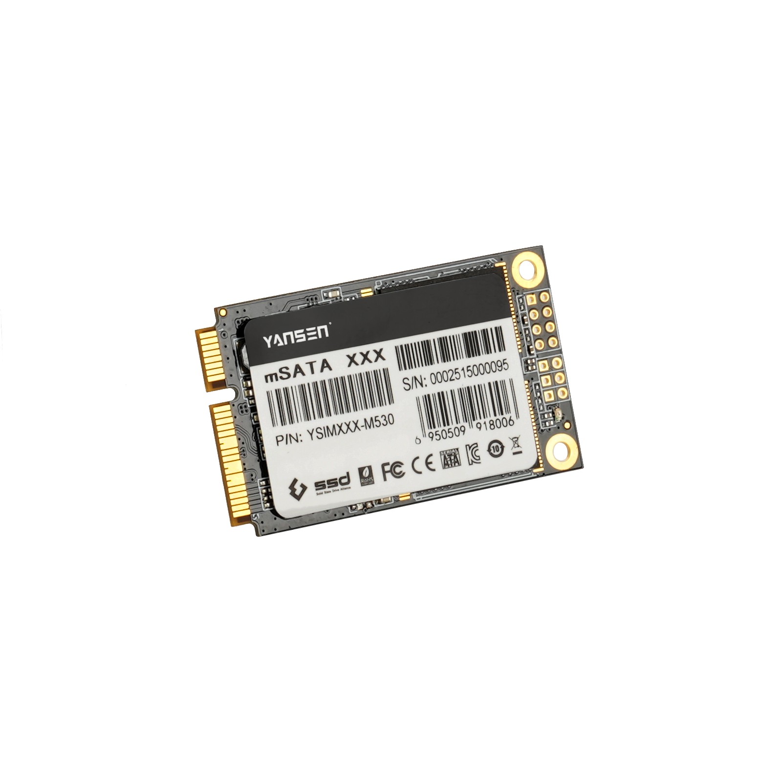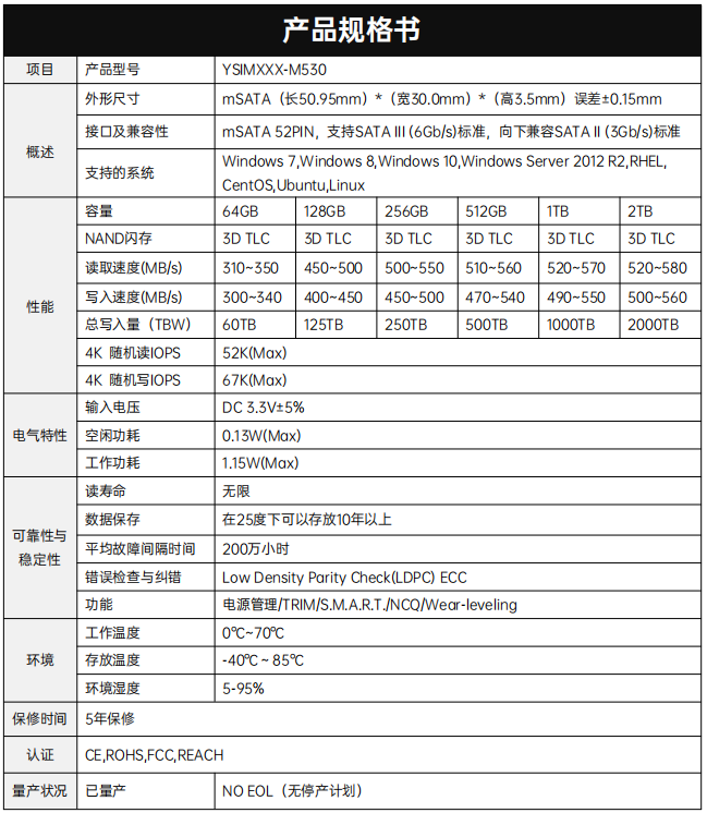 YSIMXXX-M530產品采用2通道SSD控制器和3D NAND Flash,接口尺寸為 mSATA,小巧的尺寸讓該產品可以集成在平臺內。