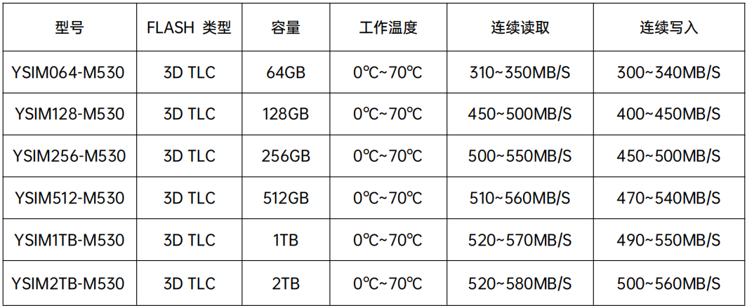 YSIMXXX-M530符合串口ATA I/II/III 標準并支持SATA 3.2協議。YSIMXXX-M530使用3D TLC NAND Flash。因此,為了保證數據的完整性,采用了動態壞塊管理、動靜態磨損平衡、LDPC校驗糾錯等先進的技術。 此外,YSIMXXX-M530的性能遠超于傳統硬盤。