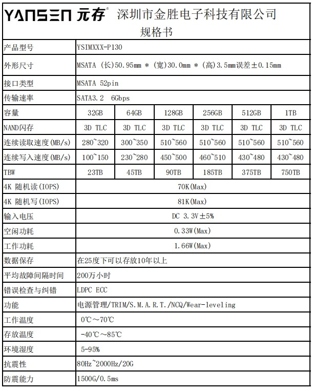 YSIMXXX-P130還包括磨損均衡和TRIM功能,以確保最佳性能和使用壽命。這款SSD具有緊湊的mSATA 52引腳外形,在高達70℃的溫度下運行可靠,是滿足您所有存儲需求的最佳性能選擇。